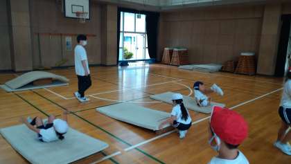 今日からは、1,2組が運動場で、3,4組は体育館でそれぞれ行っていきます。はじめの段階では、あそびの中から体の使いこなしやその楽しさを感じていきます。途中に水分補給の時間をはさみながら、しっかりと体を動かしています。