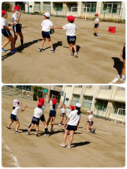 ハンドボールは、コートの端においた箱にボールが当たると1点獲得です。チームで作戦を考えながら、協力してたくさん点を取ろうとみんな一生懸命です。点が取られないように積極的にボールをカットする様子もみられました。