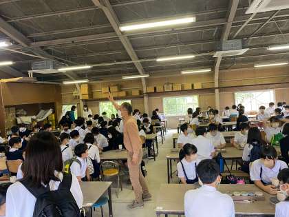 説明を聞いて、湯呑みに絵付け体験スタート!