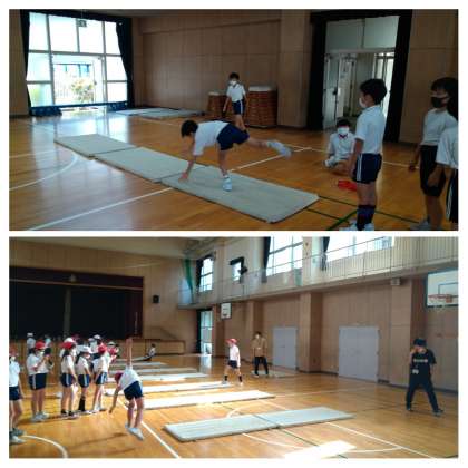 体育館では、マット運動に取り組んでいます。苦手意識をもつ子も多く、さまざまなコースをつくり、いろいろな回り方を練習しています。