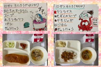 火曜日は、沖縄料理のひとつである、『タコライス』が登場しました。いためたひき肉、玉ねぎをカレー粉、ケチャップ、ウスターソースなどで味つけし、青みにグリンピースを使い、ご飯の上にかけて食べます。