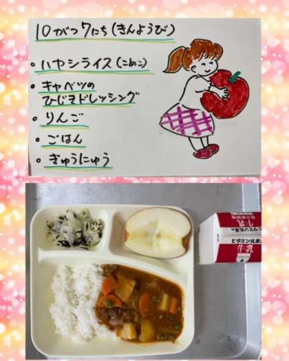 『ハヤシライス』は、米粉を使い、小麦アレルギーの児童も食べることができるようにしています。子ども達に大人気の献立となっています。