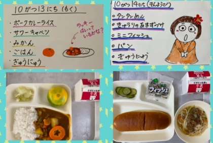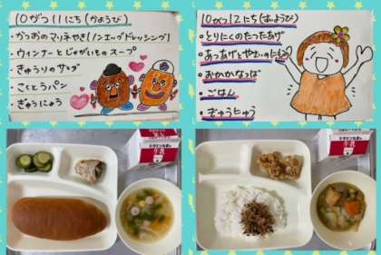火曜日の『かつおのマリネ焼き』は、ノンエッグドレッシングを使い、卵アレルギーの児童も食べることができるように工夫された献立です。