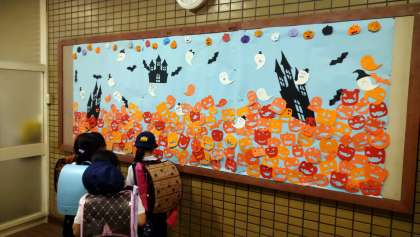 今日はハロウィンでしたね。正門のところにある玄関掲示には、無数のカボチャがところ狭しと並んでいます。数えると100以上もあります!