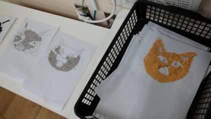 ちぎり絵でリアリティー溢れる「ねこ」を貼っていき、いまは背景を仕上げているところです。さて、どんな作品になっていくのでしょうか‥??