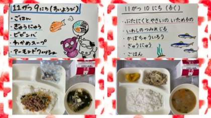 月曜日の『豚肉のスタミナ焼き』は、豚肉に、にんにく、料理酒、砂糖、こい口しょうゆ、白みそで下味をつけ、たまねぎを合わせ、焼き物機で焼いて仕上げています。