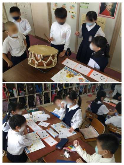 実際に手拍子をして、どうするのがいいのかなとグループで話し合い、決めていきました。最後には小鼓を使ってリズムを奏でました。