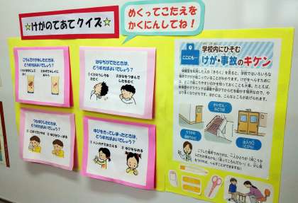 みんなが楽しく、安全に過ごせるようルールやマナーがあります。ケガをしないよう、過ごしてほしいと願っています。保健室前の掲示板には、いろいろなお知らせを貼っています。