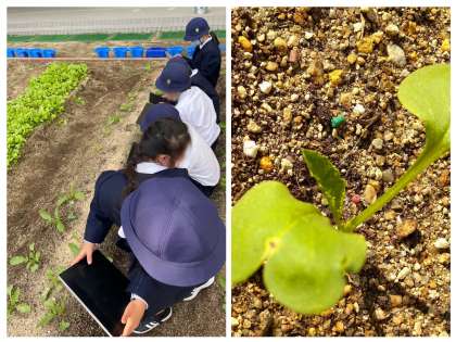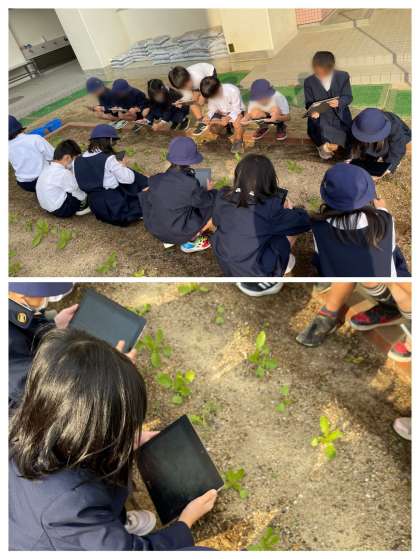 なかには「この小さな葉っぱの形ちがう!」と、細かな違いを見つけた子もいました。なんと、3年生で習う『子葉』ですね。教室に戻り、撮った写真を眺めながら観察カードに絵や文章を書きました。