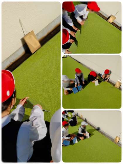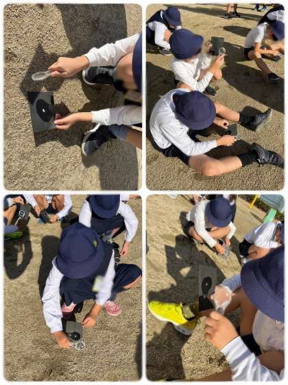また、虫めがねを使って紙の上に太陽の光を集めました。虫めがねを紙に近づけたり、遠ざけたり・・・。小さく一点に光を集めると、そこからけむりが出てきて紙に穴をあけることができました。
