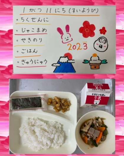 木曜日の『ぞう煮』は、かつおぶしでだしをとり、白みそを多く使った関西風のものです。白玉もちやなにわの伝統野菜でもある金時人参を使っています。