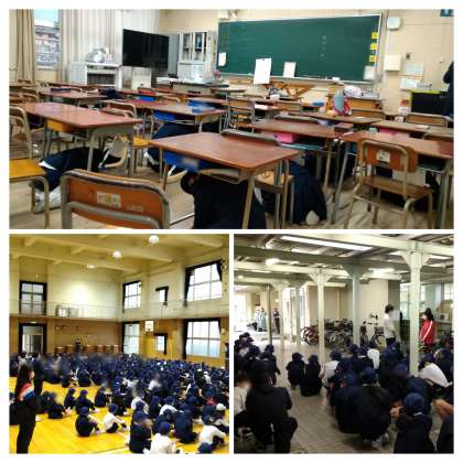 まず、紀伊半島沖を震源とした巨大な地震が起こったと想定し、避難訓練をしました。先生による講話をしたのちに、津波が来ると想定して高い階に移動して避難しました。