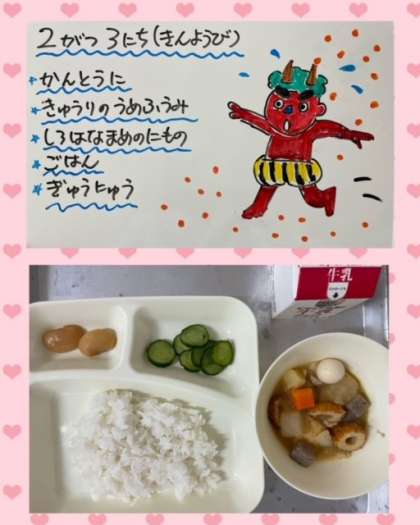 水曜日は、節分の行事献立となっています。料理酒で下味をつけたいわしを焼き物機で焼き、しょうが風味のたれをかけて仕上げています。