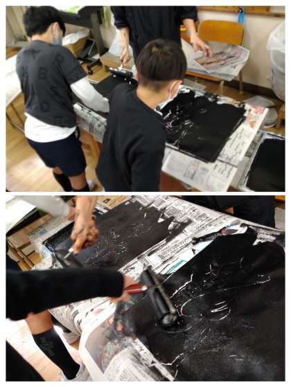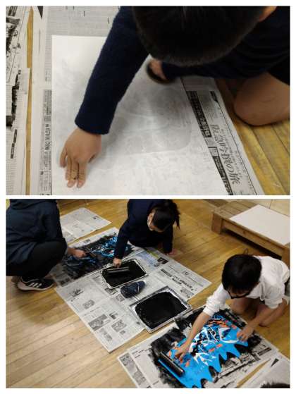 最後に、白い用紙を乗せ、手やバレンを使ってうつし取っていきます。白黒の濃淡や迫力のある絵柄が浮かび上がってきました! 乾かしてから、このあと教室に飾っていきます。