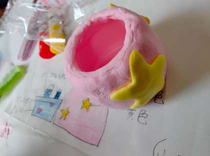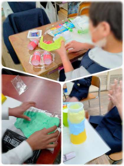 図画工作科の学習で小物入れを作っている様子です。紙粘土に絵の具を練りこみ色をつけ、空きようきをへんしんさせます。