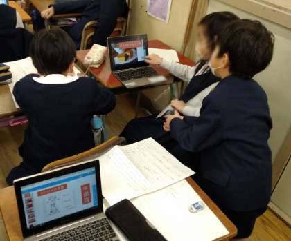 定期的に来校しているICT教育アシスタントさんとも協力しながら、学習を進めています。今回はグループで取り組んでいるので、分からないことや難しいことも、声をかけ合ったり一緒になって操作したりしながら「発表ノート」を作成しています。