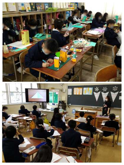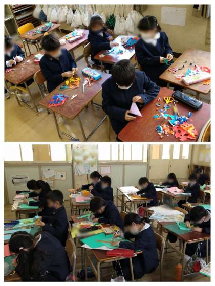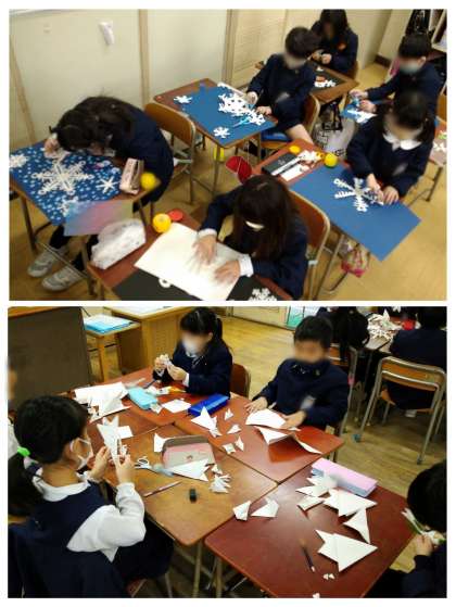 図工の授業では、廊下に掲示していた『雪のけっしょう』や、初めてのカッターで作った『まどから こんにちは』にも取り組んでいました。