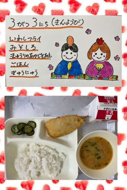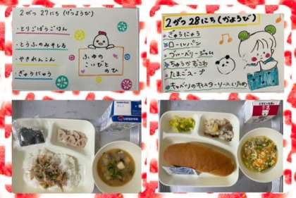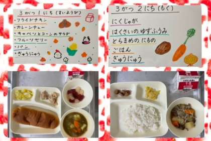 水曜日は、卒業お祝い献立でした。『フライドチキン』は大好評でした。『カレーシチュー』は米粉を使用し、小麦アレルギーの児童も食べることができる献立でした。
