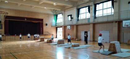 とび箱では、台の上でクルッと前回りをする『台上前転』や、膝を閉じて小さく跳び越す『かかえ跳び込み』など、さまざまな跳び方にチャレンジしました。
