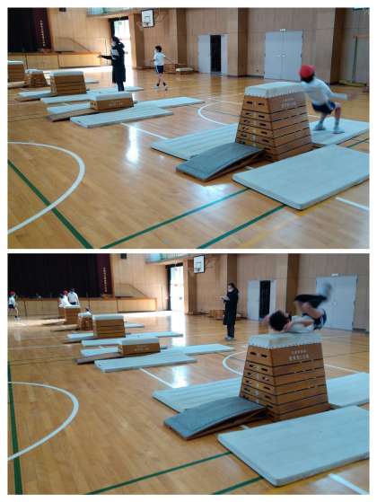 自分の身体や動き、ちょうど良い跳び箱の高さとも相談しながら、また友だちとコツを見つけたり教えてもらったりしながら、活動していきました。