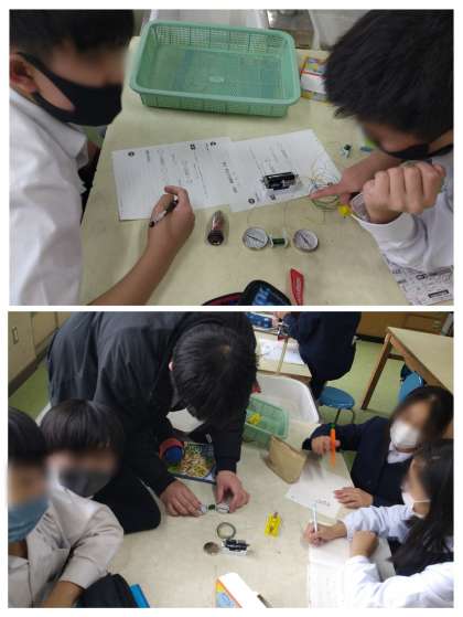 電磁石について、実験を通して学んでいます。導線を巻いている「回数」や「向き」などの違いによって比較し、考察しています。