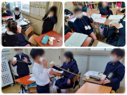 上の写真は、「音のせいしつ」の実験の風景です。音がつたわるときのものの様子を糸電話をつくって調べました。友だちの声が聞こえているときに、