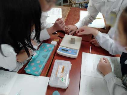 下の写真は、「ものと重さ」の実験の様子です。体積が同じでしゅるいのちがうものの重さを電子てんびんで調べました。