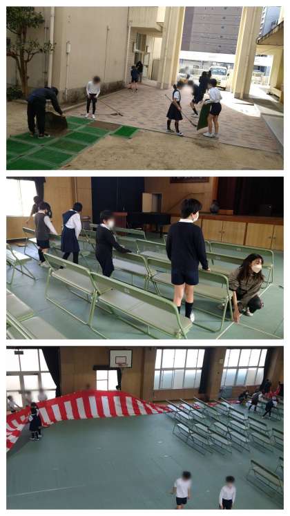 ピロティや階段、トイレなどを綺麗にしたり、式場のイスや紅白幕を設営したりしました。