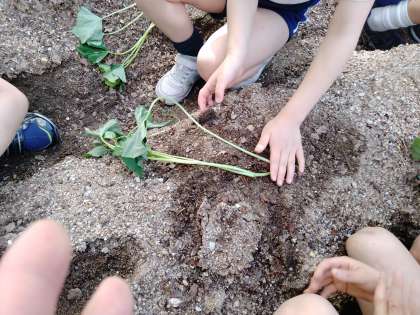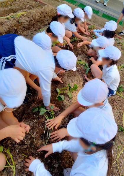 生活科の学習で、サツマイモのなえを畑に植えました。つるがたくさんのびて、立派なサツマイモが収穫できますように…!