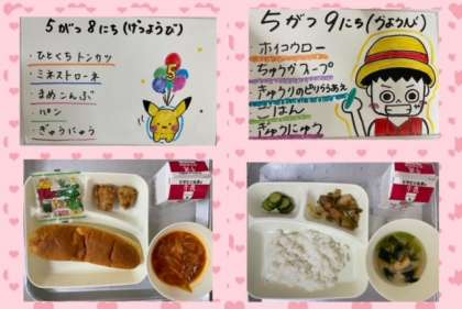 月曜日の『一口トンカツ』は、角の豚肉を使用した手作りトンカツです。卵アレルギーの児童も食べることができるように、衣に卵は使用していません。
