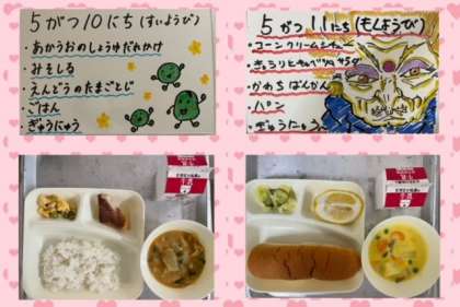 水曜日の『えんどうの卵とじ』は、旬のさやつきのえんどうを給食室でむいて使用しています。旬を味わえる一品です。