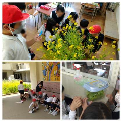 また、各クラスではモンシロチョウを育てています。キャベツの葉をあげたり、さなぎになっているところを見たりしているうちに、成虫になっていました!