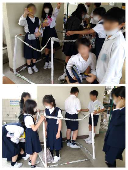 1つの辺が1mなので、子どもたちがすっぽりと入るサイズになりました。休み時間にはテントのように、みんなでワイワイとその大きさを体感していました♪