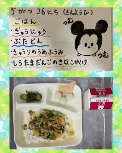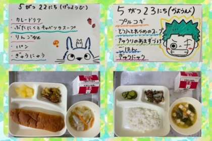 火曜日の『プルコギ』は、韓国・朝鮮の料理です。牛肉に、しょうが汁、すりおろしにんにく、コチジャン、すりごまなどで下味をつけ、たまねぎとにらを混ぜ合わせて、焼き物機で焼きます。ご飯にとてもよく合う献立です。