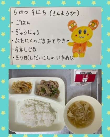 金曜日の『豚肉のごまみそ焼き』は、豚肉にねりごま、赤みそなどで下味をつけ、たまねぎ、ピーマンを混ぜ合わせ、いりごまをふり焼き物機でやいています。