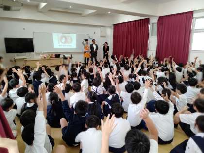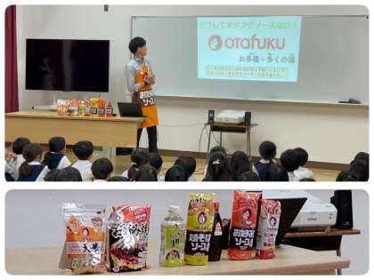 生活科の学習で行うまちたんけんの一つとして、今回はオタフクソース株式会社の方々に来校していただき、オタフクソースの歴史やソースの秘密、お仕事についてなどたくさんのことを教えていただきました。