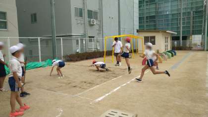 校庭の隅にある砂場で、走り幅跳びをしています。立ち幅跳びよりも遠くに跳べるはず‥踏み切りの足や体全体を使ってジャンプをします。さて、どんな記録が出たのでしょうか??