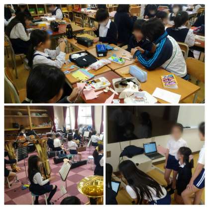 また、ハンドメイキング・ダンス・ブラスバンドクラブの様子もみられます。わいわい喋ったり音を合わせたり、タブレットで動きを確認したりしながら、みんなで協力し合っていますね。