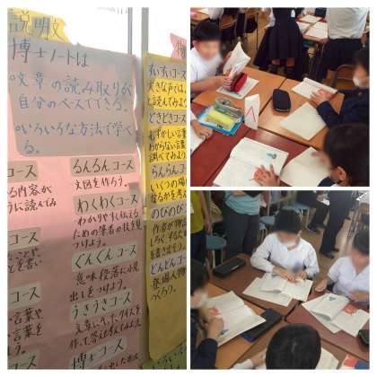 一人学びで「博士ノート」を用いて学習をしたり、グループ別になってしっかりと音読をしたりしながら、学習のめあてに向かっています。今日の課題は、作品のおもしろさとなる【表現の工夫】を見つけよう、です。