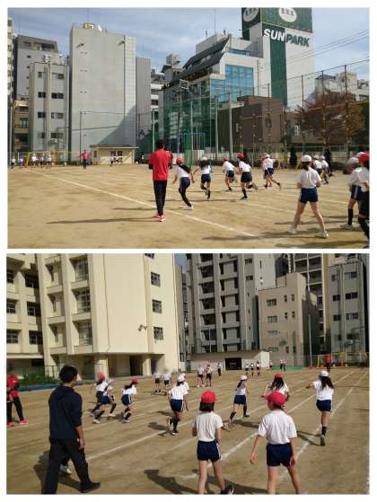 『かけっこ教室』とは名ばかりに、実業団の大阪ガスからアスリート選手を招き、本格的な授業をしていただきました。