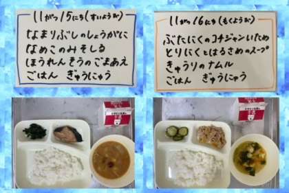 木曜日の『豚肉のコチジャン炒め』は、豚肉とだいこんを使用したいためものです。にんにくで風味を加え、コチジャンを使用し、甘辛い味つけにしています。