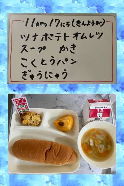 金曜日の『ツナポテトオムレツ』は、液卵、ツナ、じゃがいもを使用し、焼き物機で焼きます。ケチャップをつけていただきます。