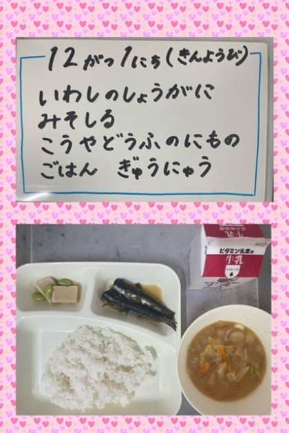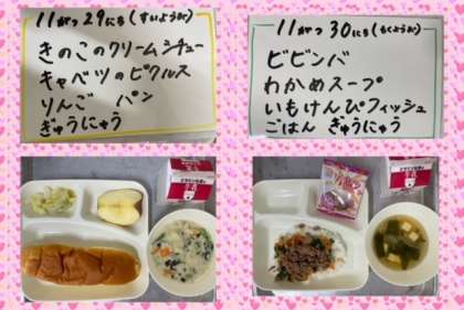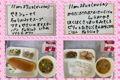 火曜日は、令和4年度学校給食献立コンクール優秀賞に選ばれた献立が登場しました。献立を考えた児童のねらいは「少し寒くなる時期に、風邪をひかず、体を温め、元気に過ごせる」です。『体ポカポカ鶏肉の生姜焼き』は、鶏肉にしょうが汁、にんにく、砂糖、料理酒、みりん、こいくちしょうゆ、綿実油で下味をつけ、玉ねぎを合わせて焼き物機で焼いています。
