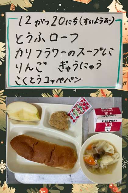 水曜日の『とうふローフ』は、学校給食献立検討会議で開発された新献立です。ツナ、たまねぎ、でんぷん、調味料を練るようによく混ぜ合わせ、大切りのとうふ、粒状の大豆を加え、ミニバットにいれて焼いて仕上げています。ケチャップをつけていただきます。
