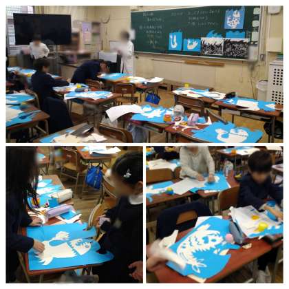 先月から引き続き、図工では『海のぼうけん』として、画用紙を切り貼りしています。