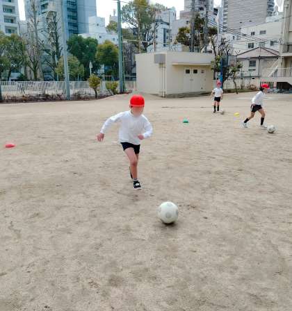 一人でのボール慣れから始まり、二人組でのパス、そしてドリブル練習などボールと仲良くなる活動に取り組んでいます。