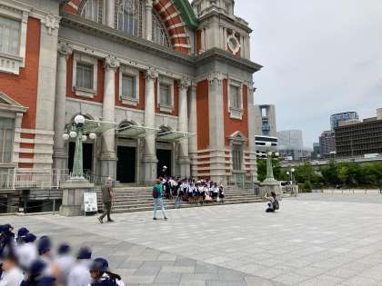 有名な中央公会堂は、レンガ作りでアーチ状の屋根がとてもきれいな建物です。国の重要文化財に指定されています。少し離れたところから眺めたり、クラス写真を撮ったりしました。