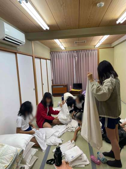 6時の起床から、身支度を済ませ、布団の整理、シーツたたみと協力して取り組んでいます。