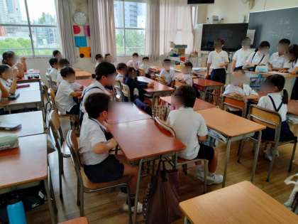 班のみんなが集まると、班長さん中心に自己紹介をしたり、子どもまつりのことや朝の集会でするゲームについて話したりしました。