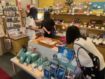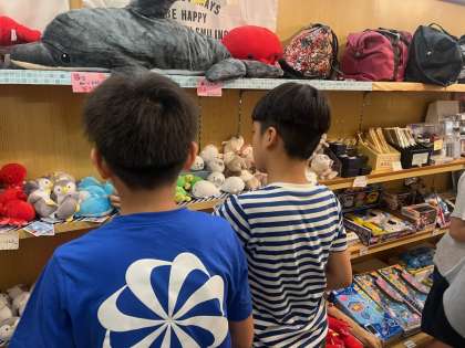 宿の中にあるおみやげもの屋さんで一生懸命選んでいます。